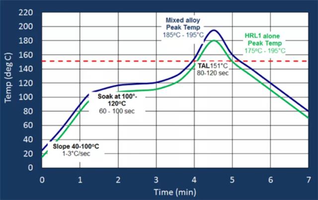 HRL1焊錫可以使峰值回流溫度低到185-190°C,使用SnAgCu焊錫球組裝的BGA封裝(即與SAC的混合焊點(diǎn)),或者使峰值回來溫度達(dá)到170-175℃,用于均質(zhì)HRL1焊點(diǎn)。